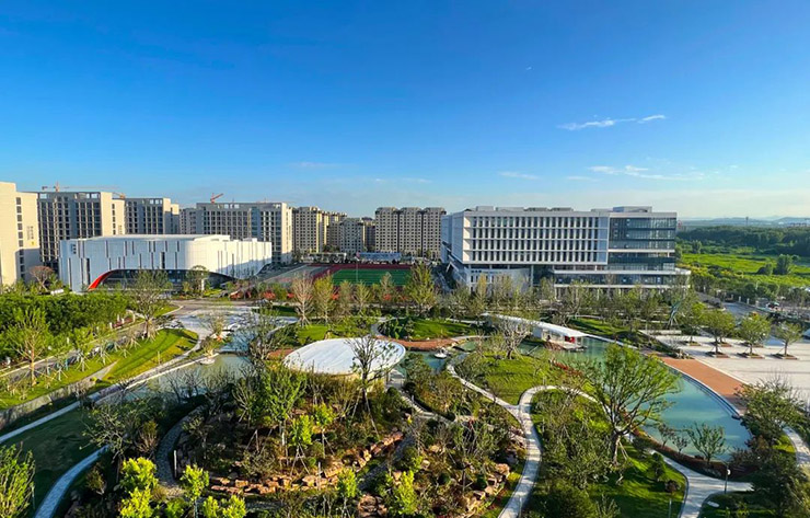 青科大淄博基地項目是淄博市重點引進的高校項目,一期工程總建筑面積27萬平方米,可滿足5000名師生的實驗實習需求。項目全部采用裝配式結構,均達到了星級標準,僅用138天就實現(xiàn)了一期所有工程主體結構全面封頂。科技元素與自然景觀在這里奇妙相融,將建筑自然融合到園林景觀中,令人心曠神怡。