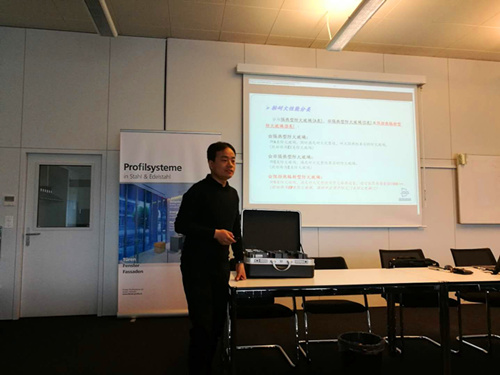 Forster總部學(xué)習(xí)交流現(xiàn)場(chǎng),吉美克總經(jīng)理給瑞士Forster同事介紹中國防火規(guī)范及應(yīng)用技術(shù)