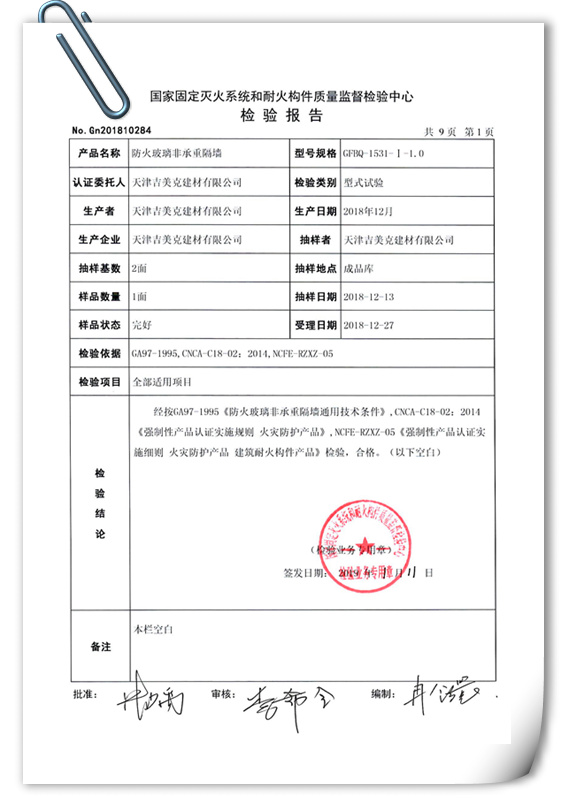 GMQ丨吉美克 A類防火玻璃非承重隔墻通過(guò)1小時(shí)耐火完整性及隔熱性型式檢驗(yàn) |
