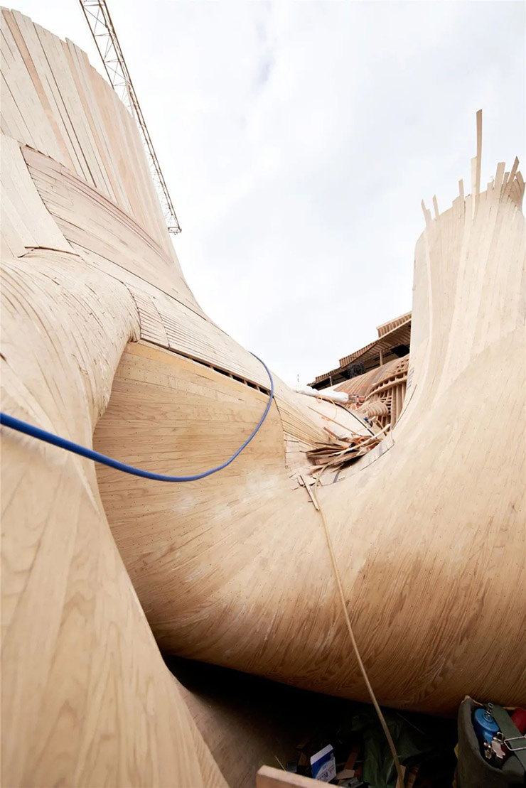 △ 駐場建筑師尚立正在檢查異形模板 攝影:奧觀建筑視覺