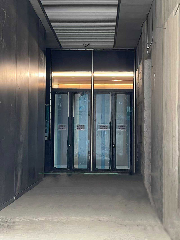 我公司負(fù)責(zé)承建該項(xiàng)目隱框系統(tǒng)門供貨及安裝工程。此款隱框門采用創(chuàng)新的隔熱型材,以其獨(dú)特的型材結(jié)構(gòu)和隔熱復(fù)合方式增強(qiáng)了型材的物理性能和結(jié)構(gòu)強(qiáng)度,可配套全隱藏式五金配件,滿足優(yōu)異的隔熱及隔聲性能同時兼具防火性能,適用A類可開啟式門窗的防火需求。