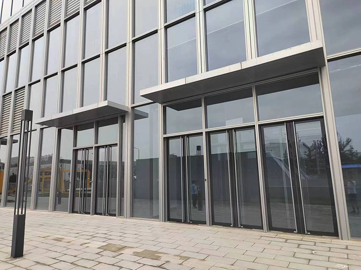 我公司承建該項(xiàng)目64樘鋼制隱框地彈門,產(chǎn)品采用我公司專利研發(fā)隱框技術(shù),門體采用鋼制框架,使用彩釉玻璃外置安裝方式隱去門框,使得門與玻璃幕墻融為一體,兼具建筑美學(xué)效果,塑造出高層工業(yè)廠房純凈簡(jiǎn)潔、輕盈通透的外觀形象,突破人們對(duì)傳統(tǒng)工業(yè)廠房形象的認(rèn)知,搭配數(shù)字樓宇、智能化設(shè)施以服務(wù)企業(yè)員工,為大家提供更加賞心悅目、更加舒適的辦公空間。