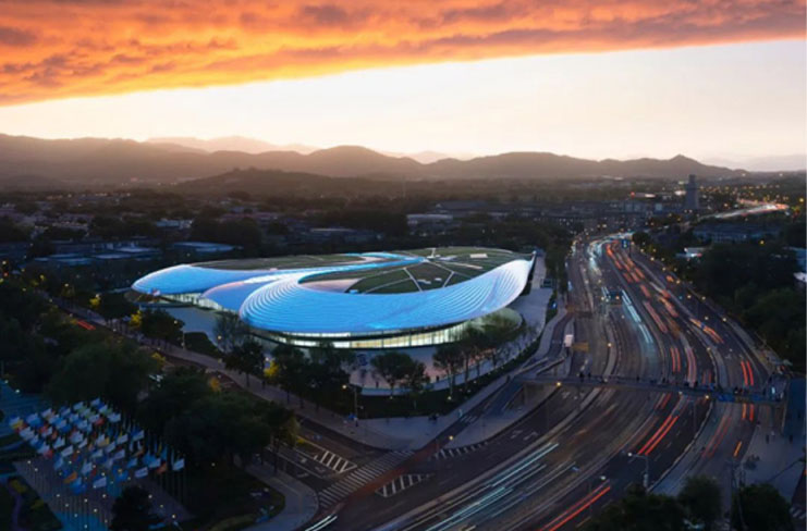 建筑的形態(tài)在大地上由北向南緩緩舒展。從不遠(yuǎn)處的三山向會(huì)址方向遠(yuǎn)眺,建筑體量完全消隱于城市中,綠色屋面以含蓄謙遜的姿態(tài)融入五園三山環(huán)境中,成為其在城市內(nèi)的綠色延伸,也成為都市中難得的大地景觀。