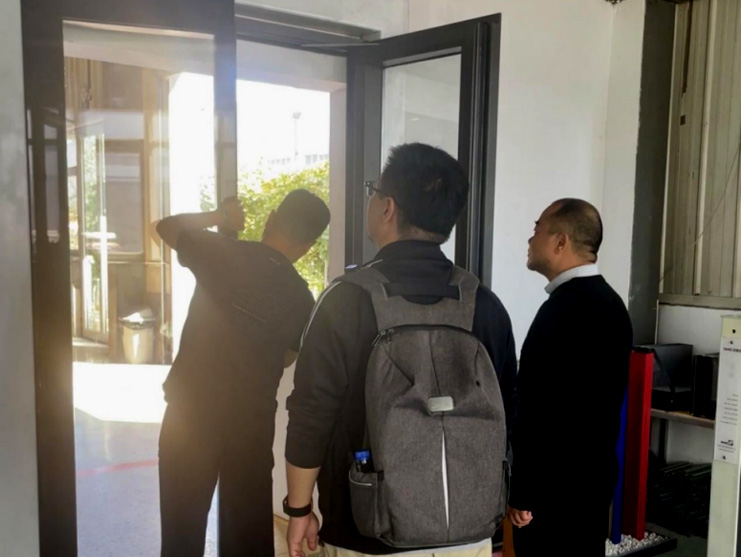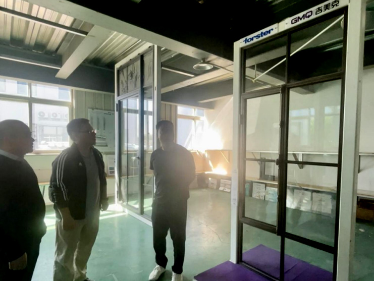 (吉美克左總正在講解公司自主研發(fā)的鋼制隱框門)