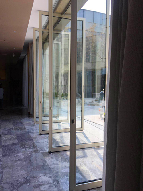 該項目整體采用手動中軸門,將售樓處內(nèi)廷部分四面墻用大面板通高中軸門進(jìn)行空間分隔處理,門扇關(guān)閉時,