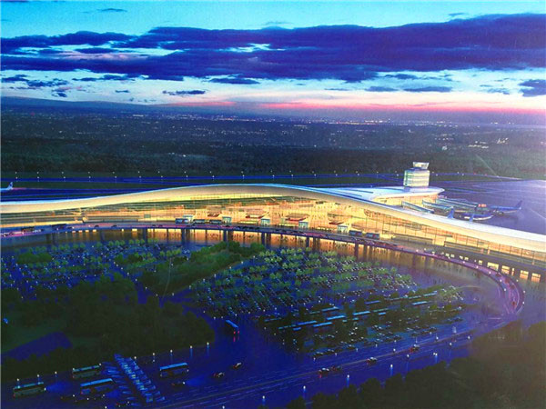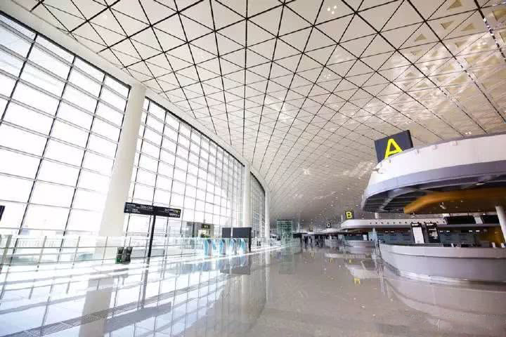 從平面圖上看,建筑平面呈“人”字型,由主樓和東、南、西三個指廊以及連廊組成,三個方向的指廊呈放射性布局,這樣的設計,不但方便旅客步行至各個登機口,而且,從安檢口至最遠的登機口不超過300米,有效減少了旅客的步行距離和中轉時間。